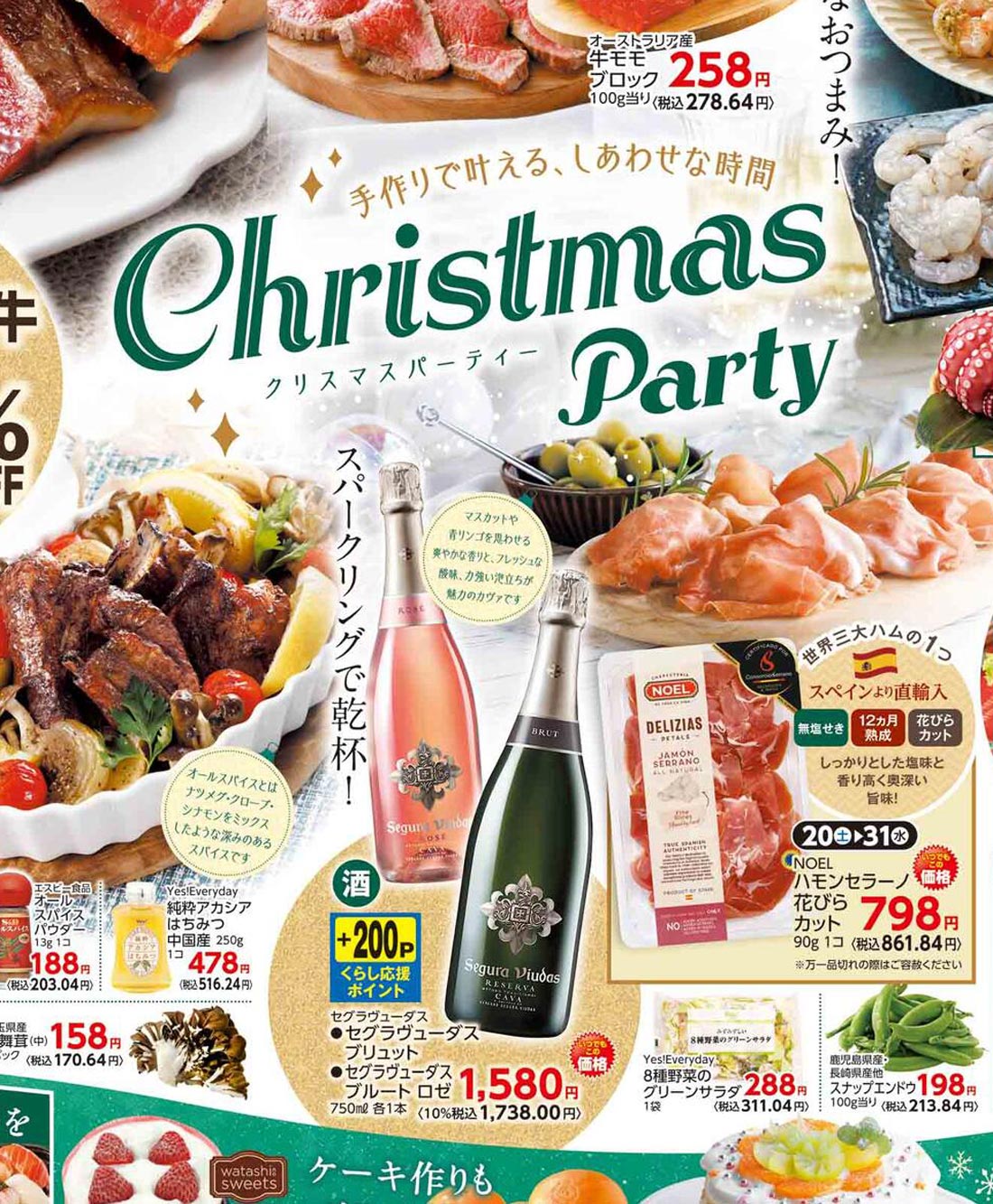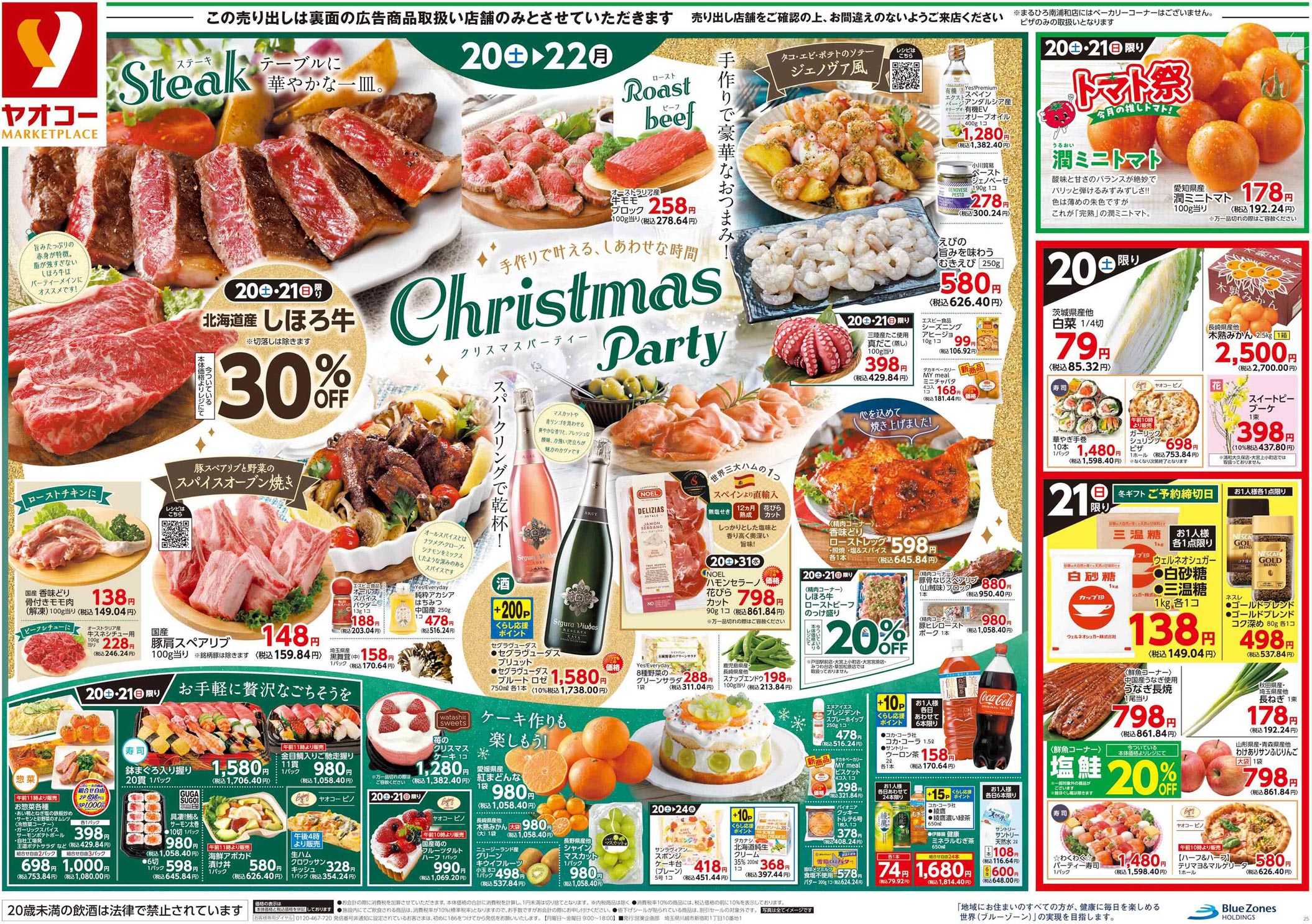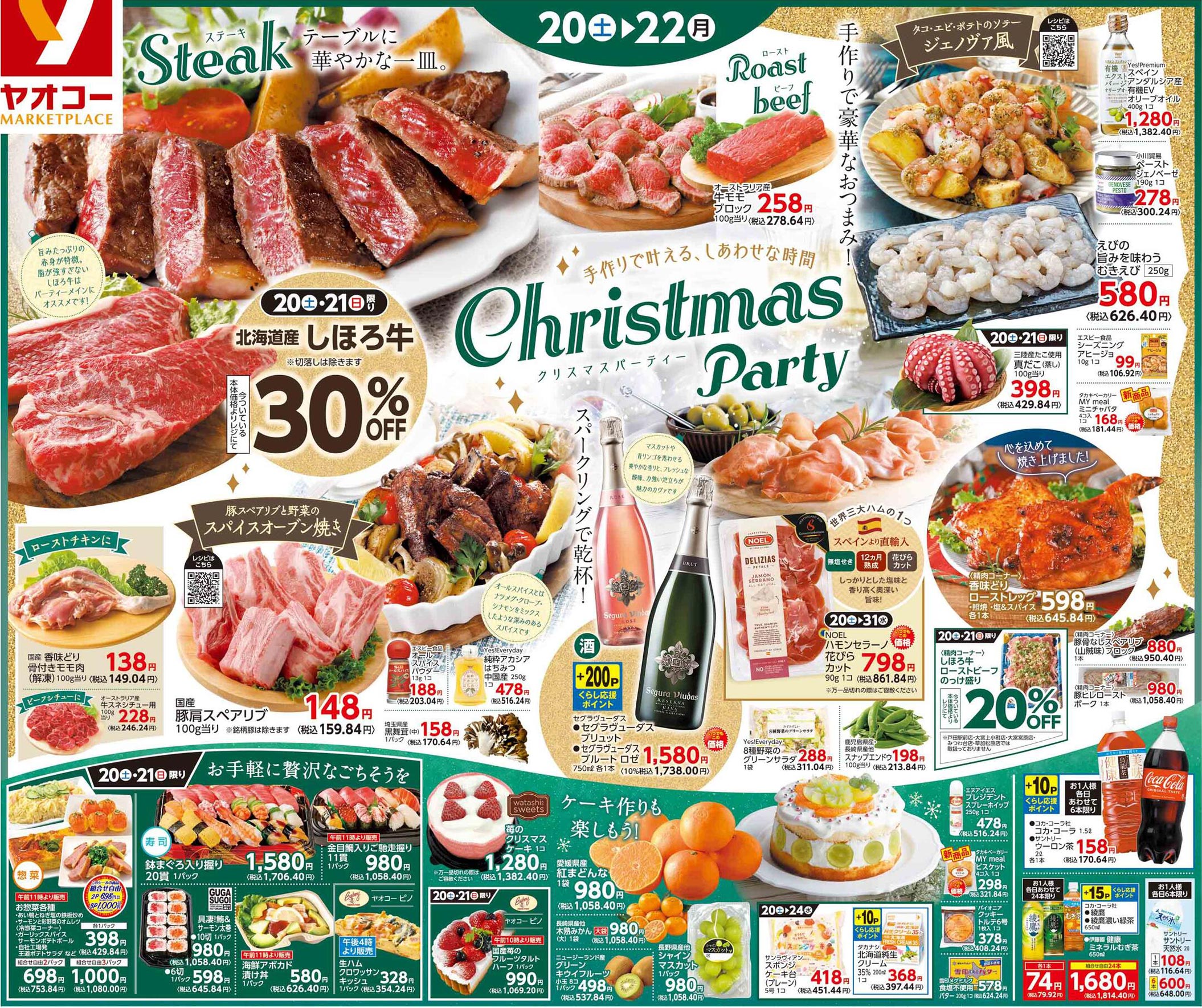 食品スーパーであるヤオコー2025年12/20号のチラシです。クリスマスの企画意図が紙面構成に反映されています。