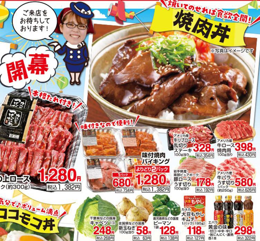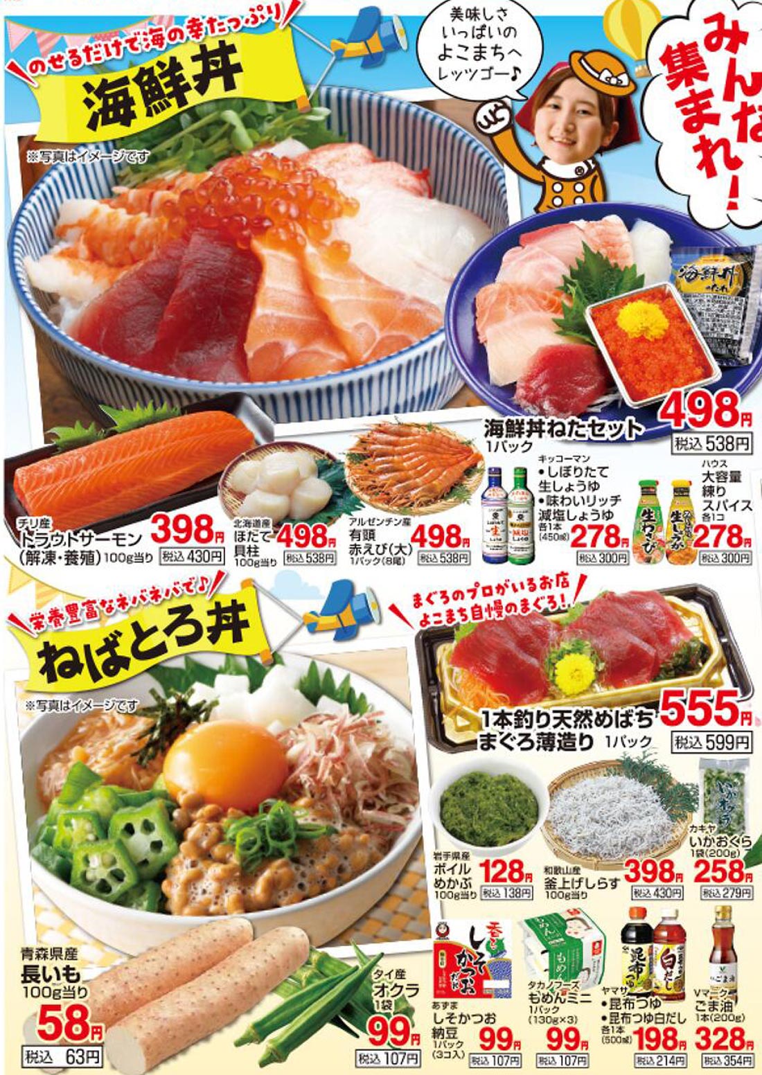 よこまちストア2025年4/19号(食品スーパー)のチラシ内容を紹介します。丼を中心に、ポップな要素とデザインフォント・イラスト使用・人物の表現で構成されたデザインです。