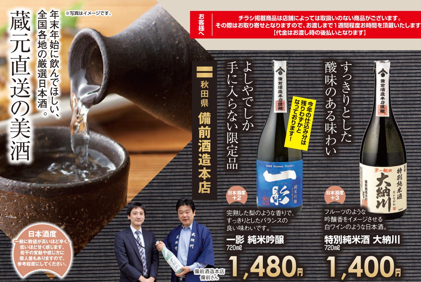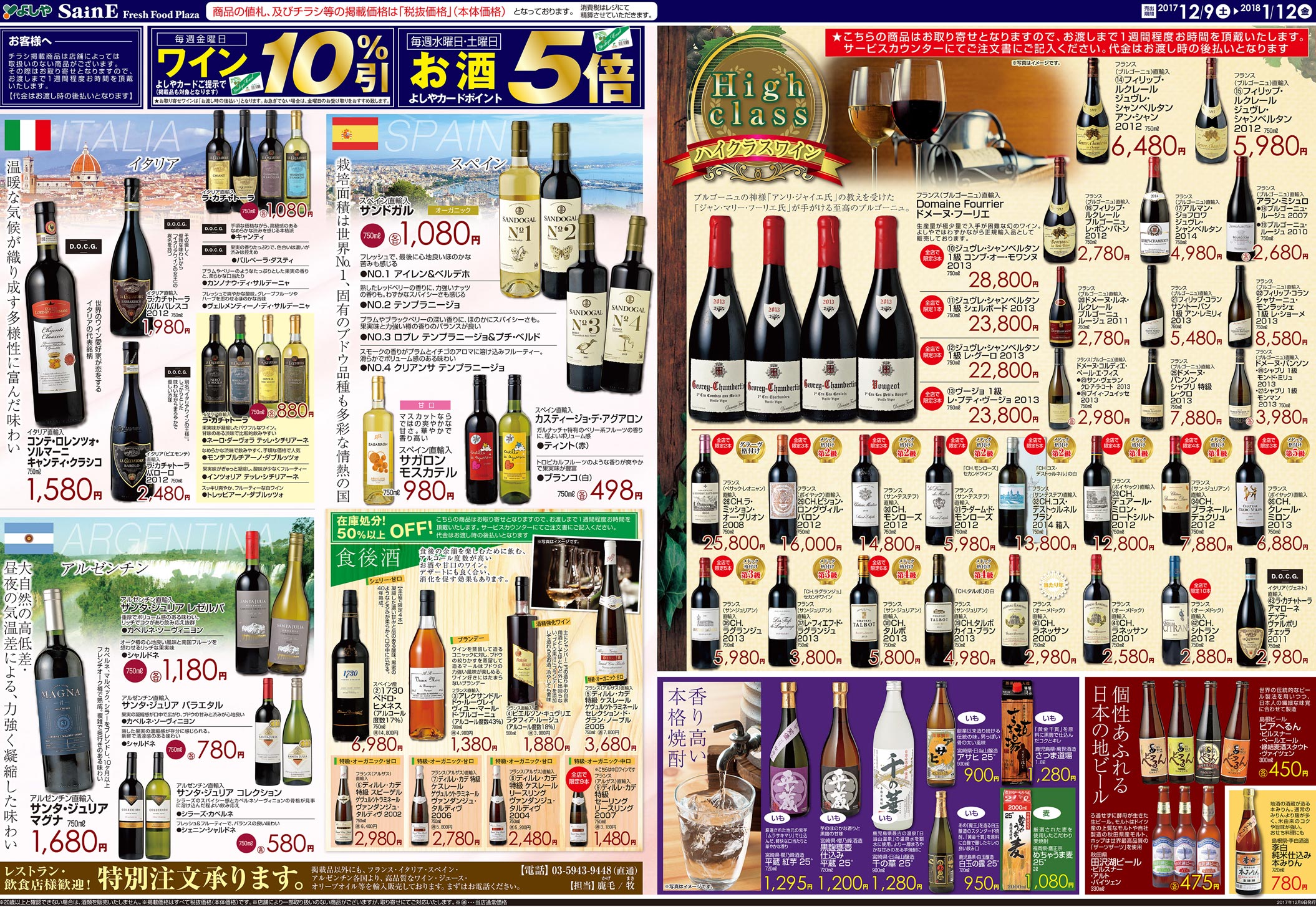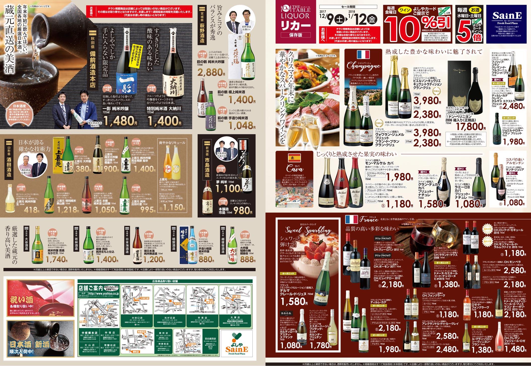 よしや2017年12/9号(食品スーパー)のチラシです。酒・飲料をテーマに、シンプル・スタイリッシュなビジュアルと明朝系・写真使用・人物のデザインが特徴です。