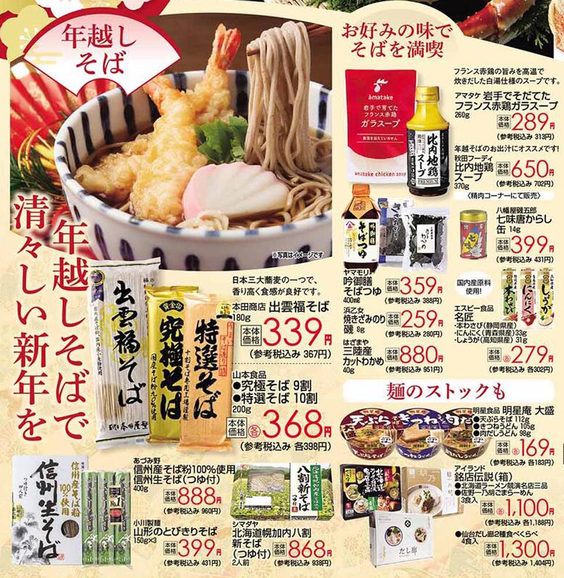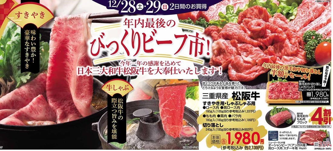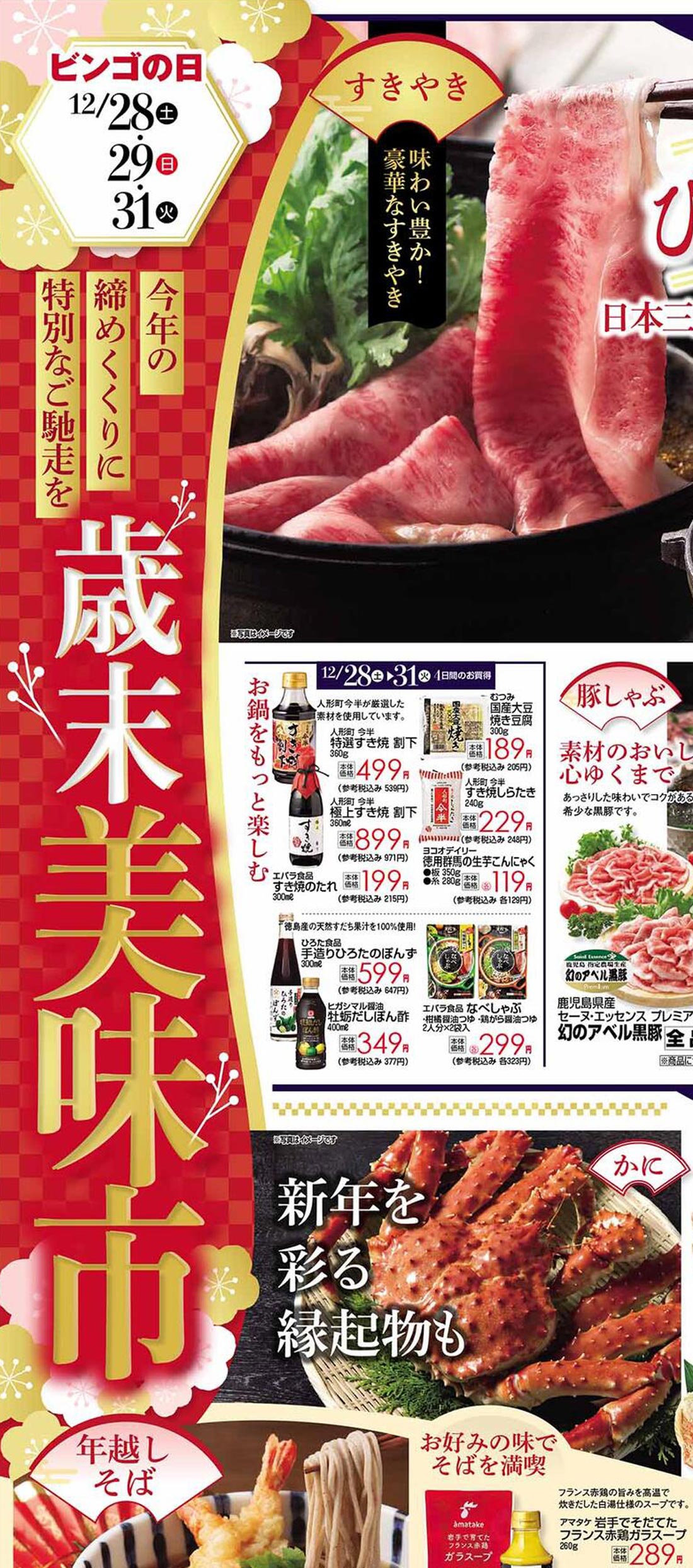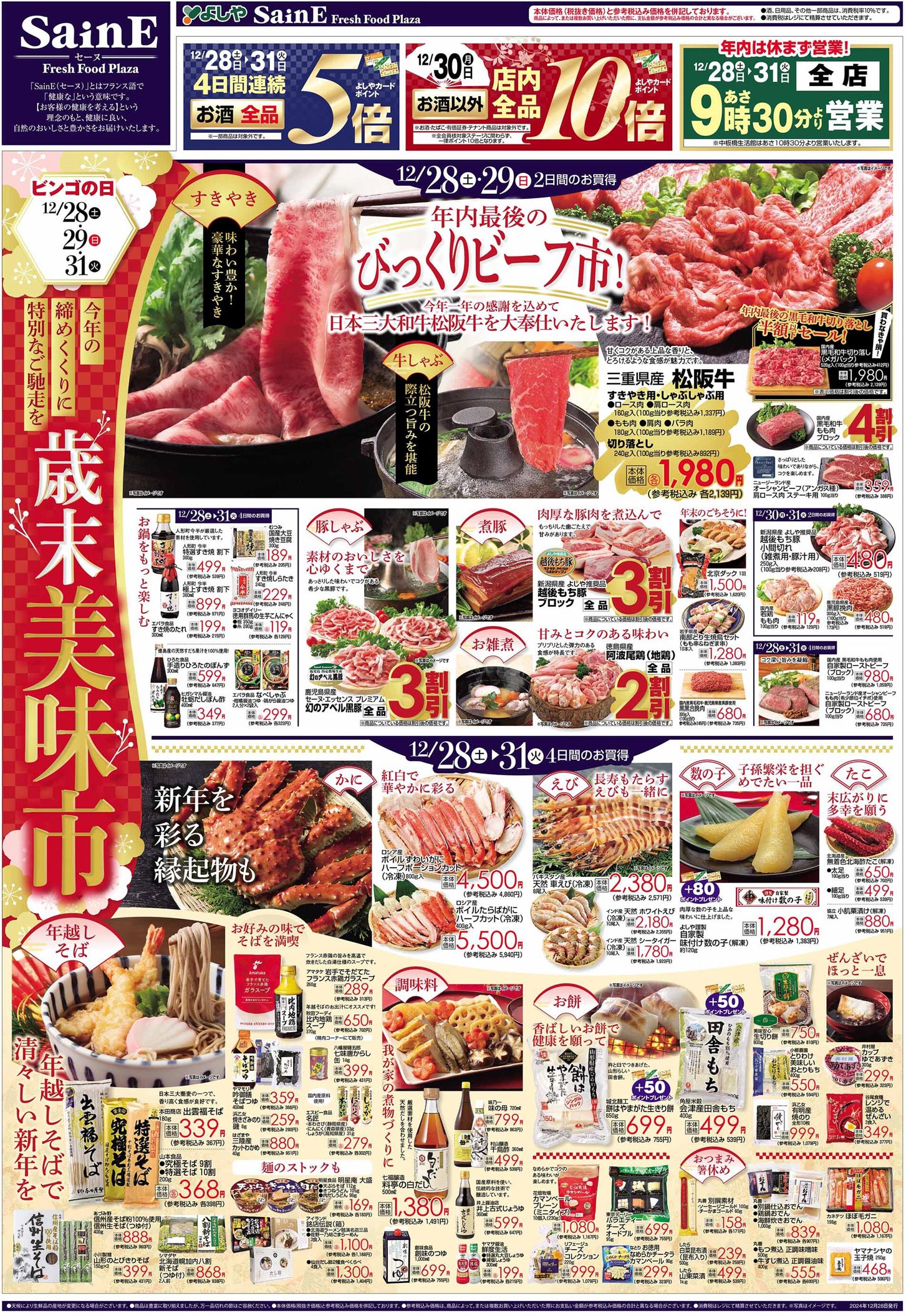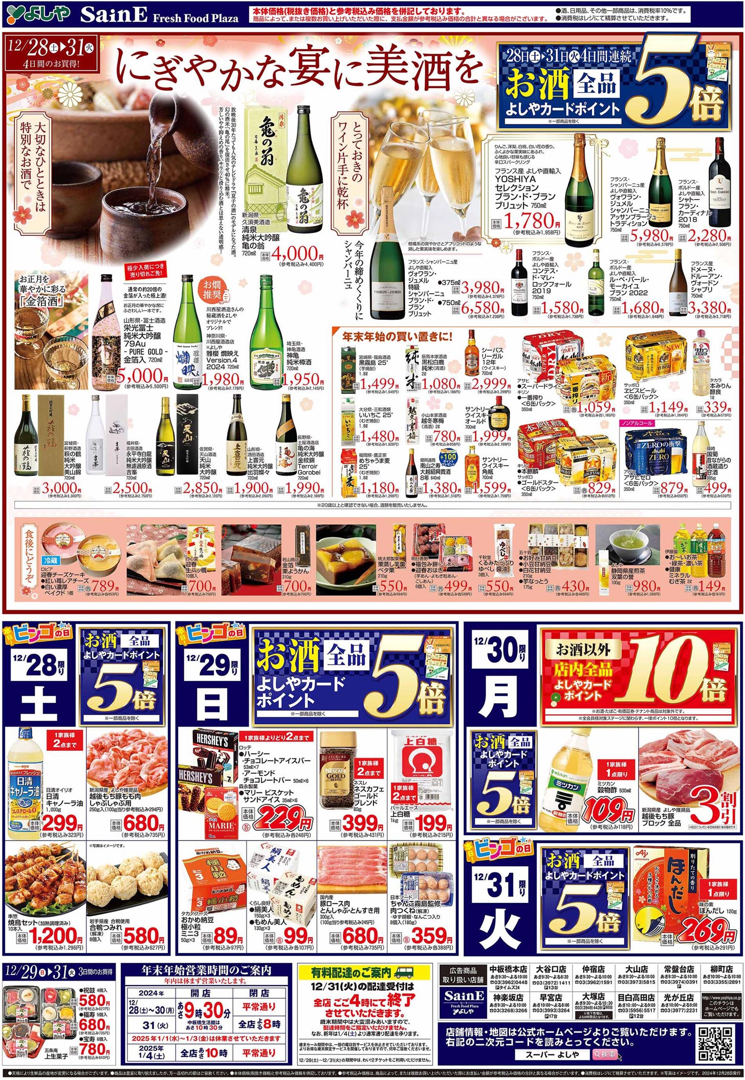 よしや2024年12/28号(食品スーパー)のチラシでは、歳末をテーマにした構成が採用されています。シンプル・高級感な印象と明朝系・イラスト使用のデザイン表現が特徴的です。