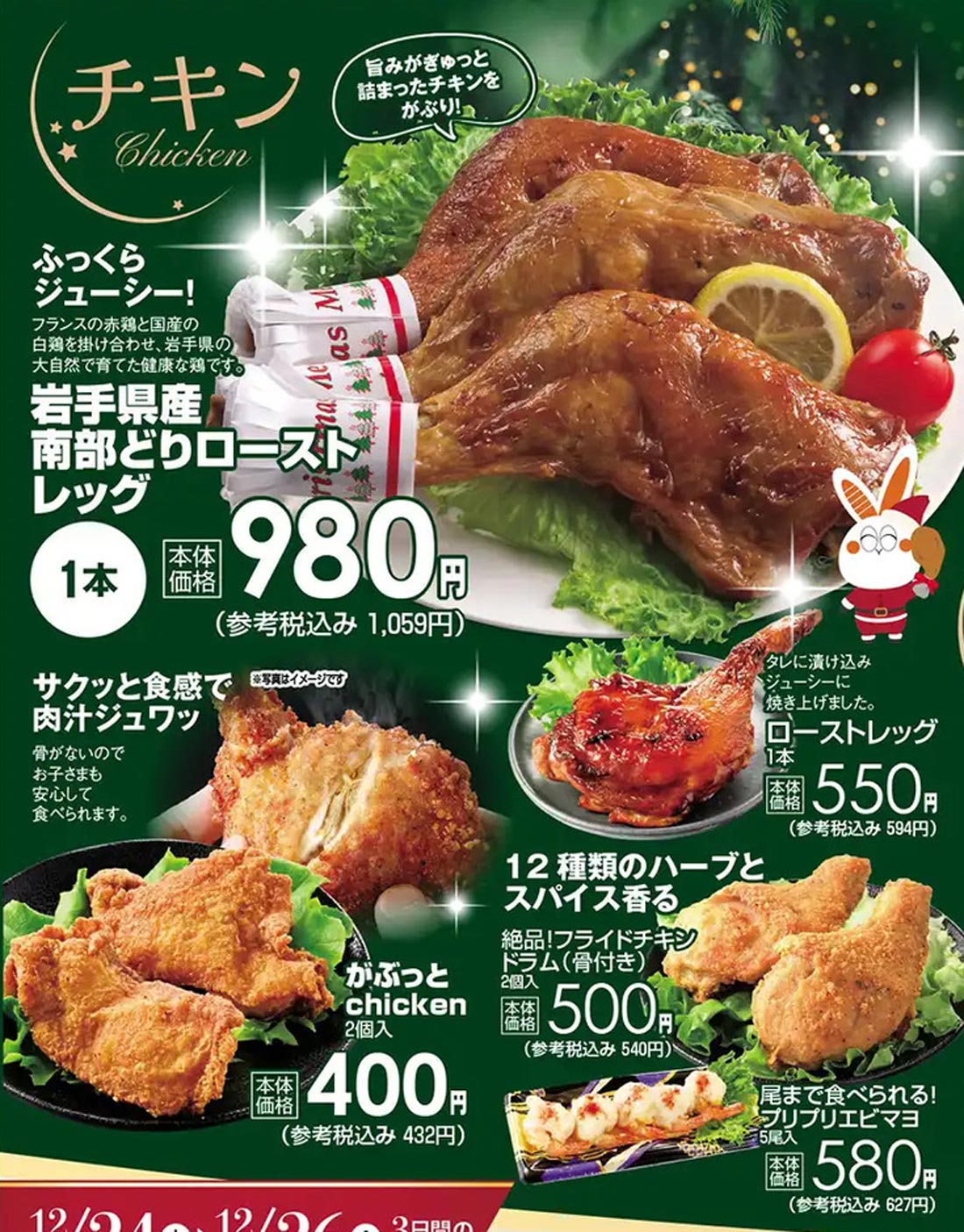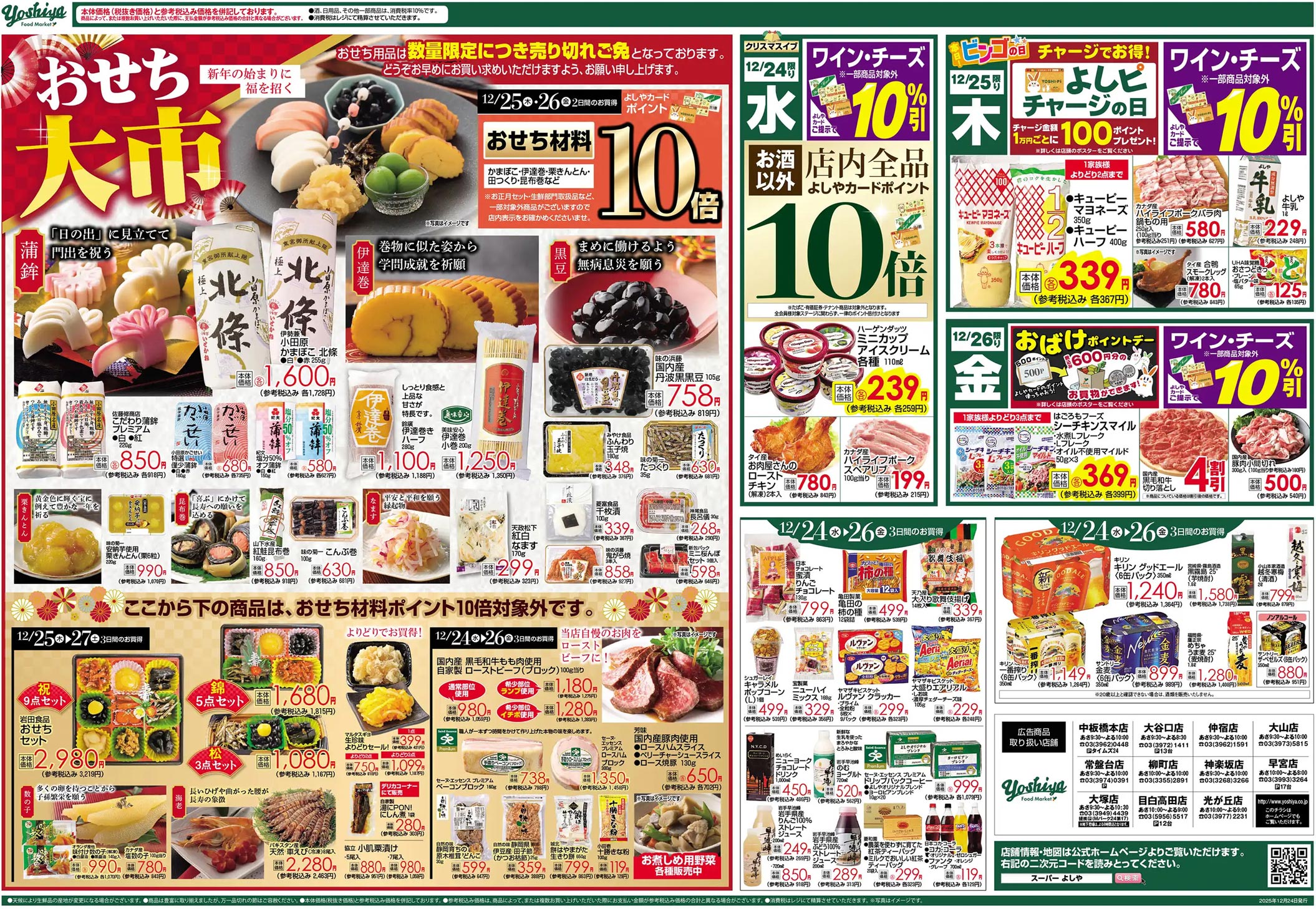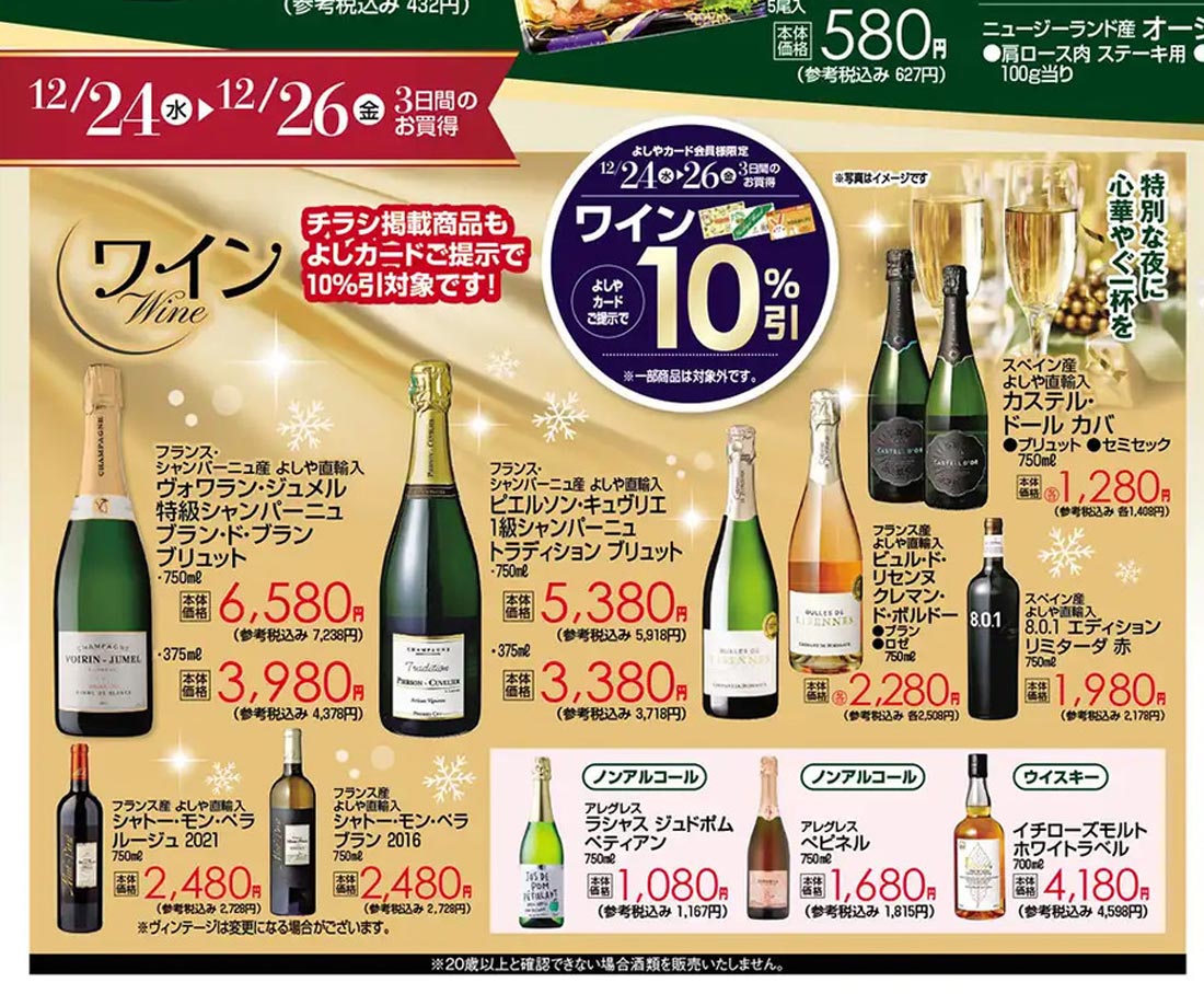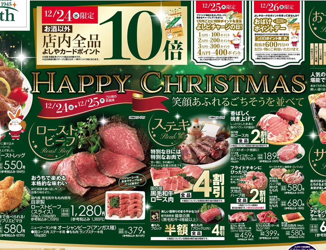 よしや2025年12/24号(食品スーパー)のチラシです。クリスマスをテーマに、スタイリッシュ・高級感なビジュアルと明朝系のデザインが特徴です。