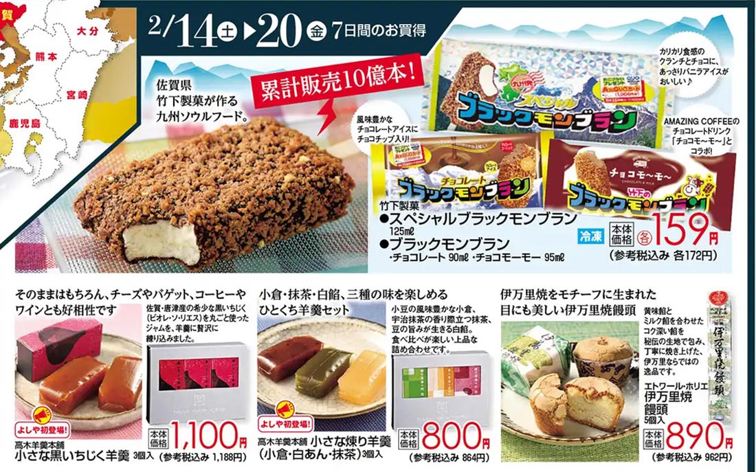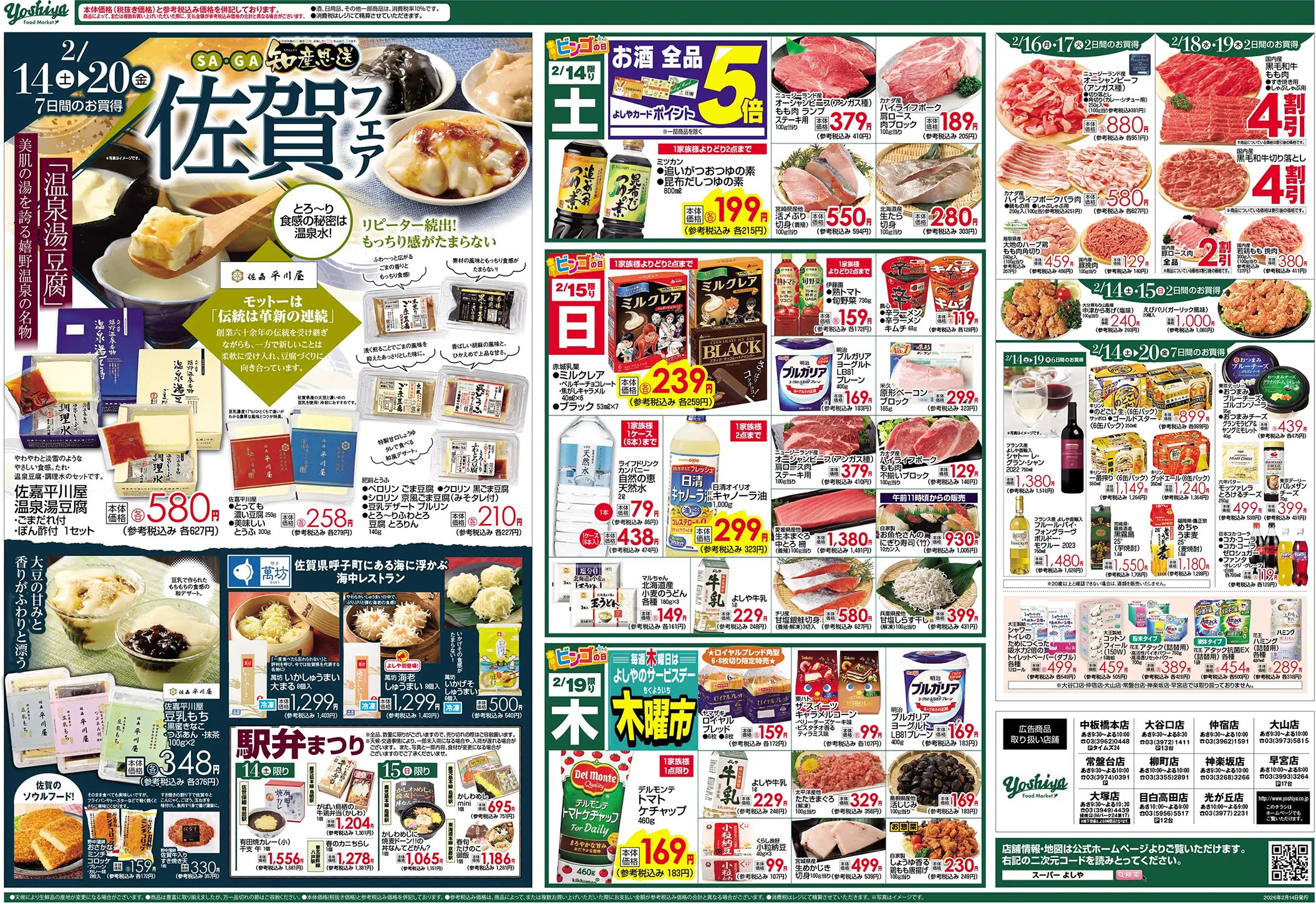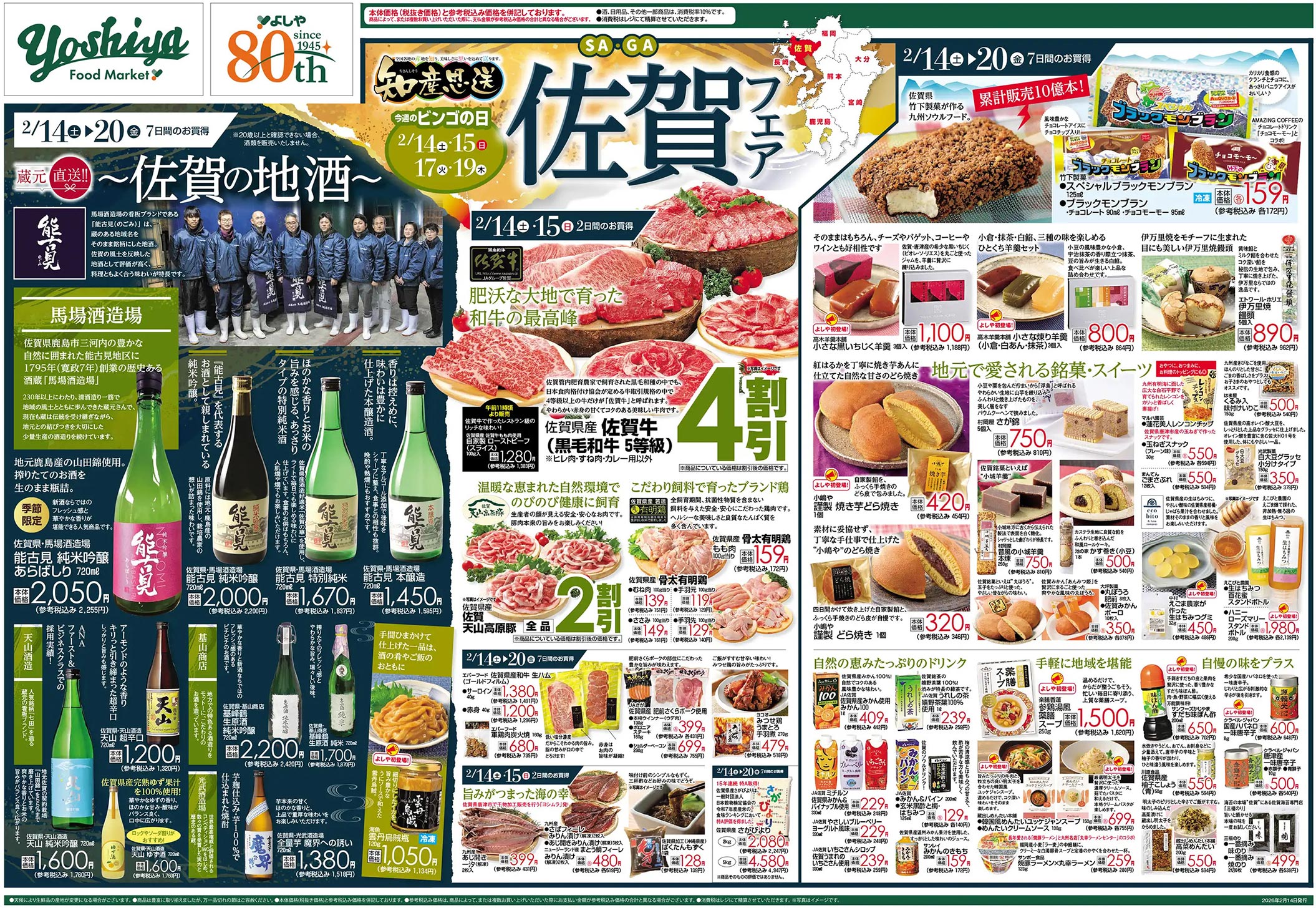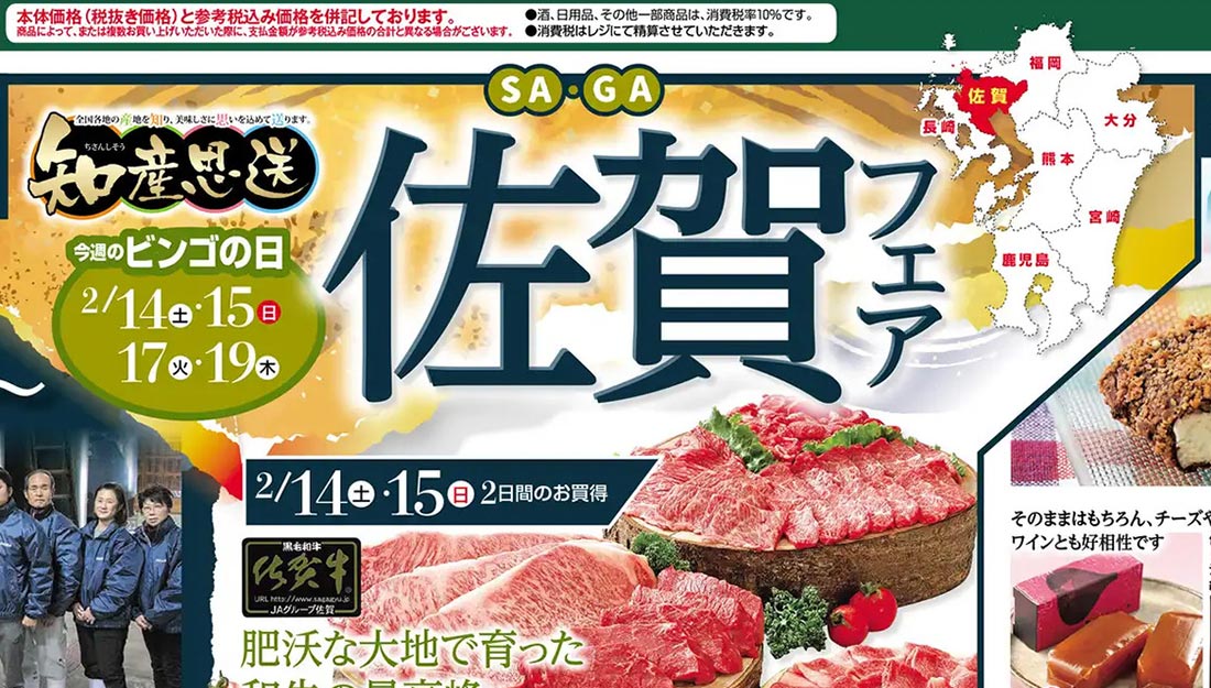 よしや2026年2/14号(食品スーパー)のチラシです。佐賀をテーマに、シンプルなビジュアルと明朝系・イラスト使用のデザインが特徴です。